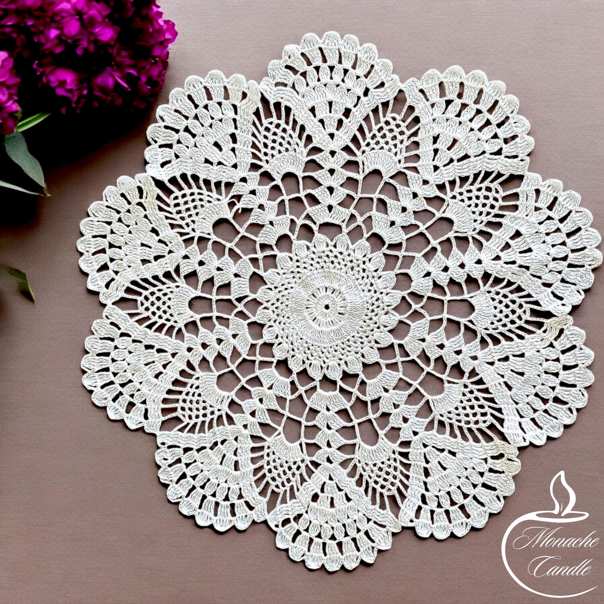 Ta serweta idealnie sprawdzi się jako dekoracyjny akcent w stylu vintage, rustykalnym czy boho, a także jako wyjątkowy dodatek do prezentu – np. do świec sojowych z mojej kolekcji.