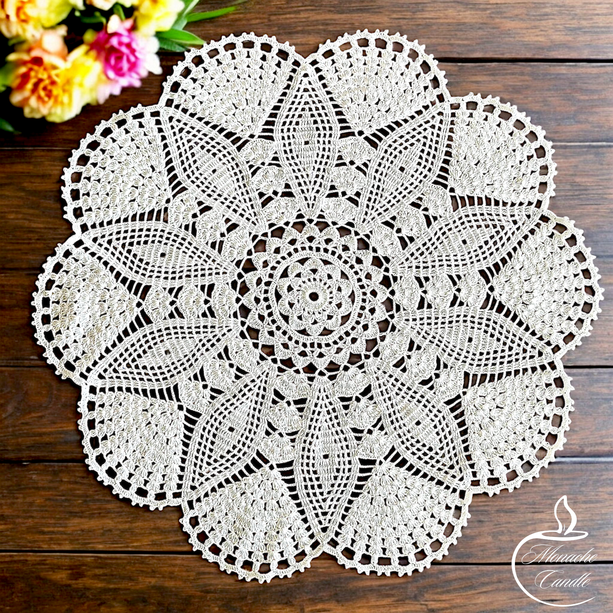 Ta serweta idealnie sprawdzi się jako dekoracyjny akcent w stylu vintage, rustykalnym czy boho, a także jako wyjątkowy dodatek do prezentu – np. do świec sojowych z mojej kolekcji.